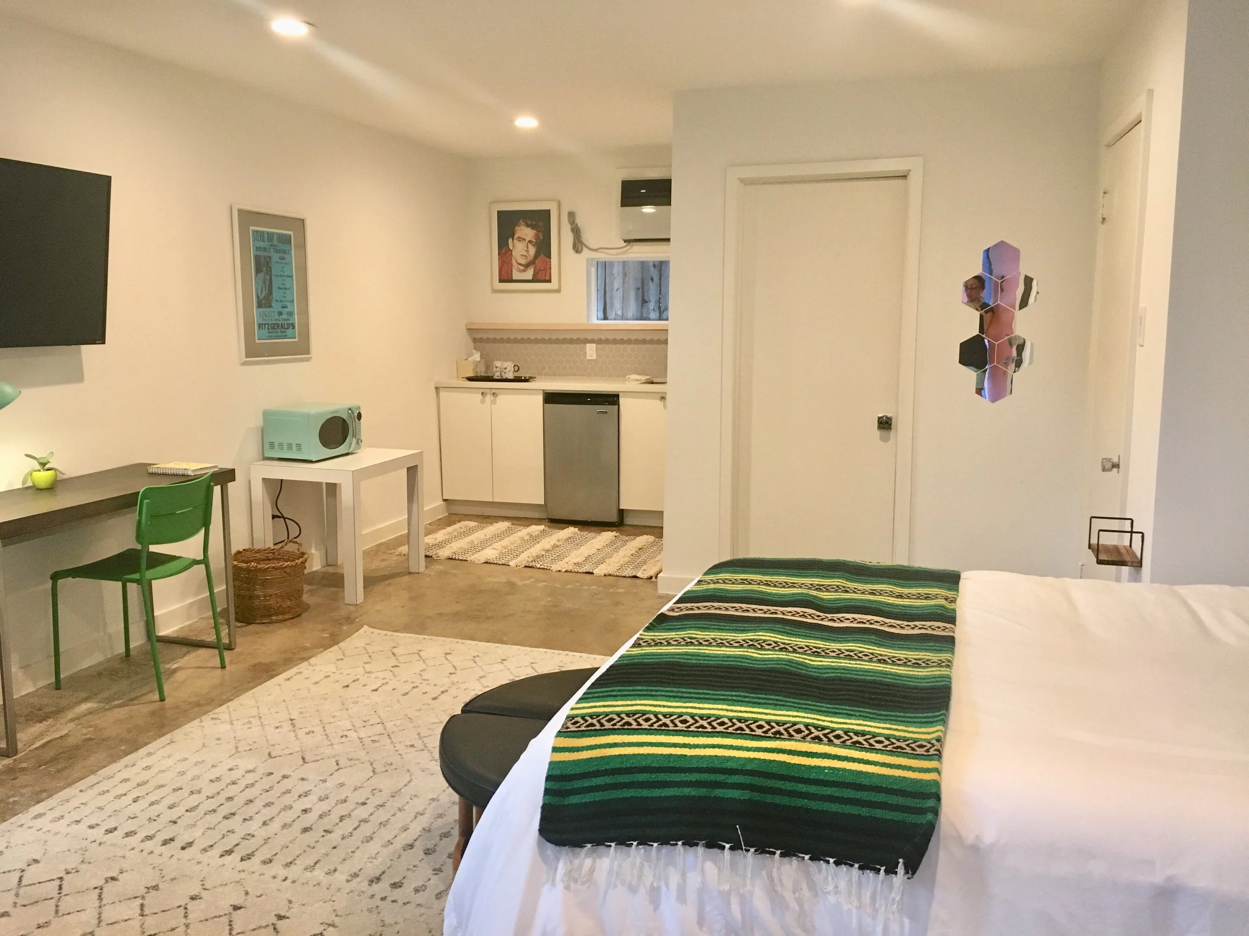 Studio 7 is also known as the "Green Room", as it is filled with verdant green decor - and for its quiet corner location at the Park JJ. Get cozy on the velvety convertible sofa or get to work at the desk where you can enjoy free access to our Wi-Fi. It has a new Queen BeautyRest mattress with soft bamboo sheets, a large 50” Smart TV, and a built-in desk long enough for two people to comfortably work or study. There is an adorable, petite kitchen with a coffee maker and complimentary coffee, microwave, refrigerator, as well as dishes and flatware for two. There is even a cool, vintage high top table, perfect for enjoying a meal or a glass of wine. *There is not an oven or stove, but we can provide a hotplate and pots/pans upon request.